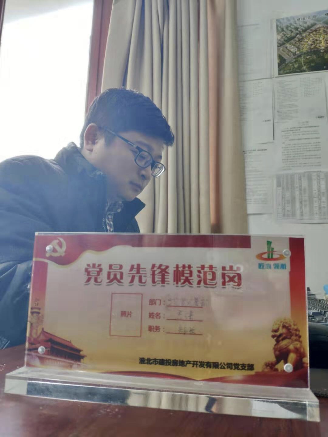 近日,房地產(chǎn)公司黨支部每個(gè)黨員的辦公桌上多了一塊鮮紅的桌牌,桌牌上黨員先鋒示范崗七個(gè)字尤為顯眼,上面還有黨員姓名和所屬部門(mén)。原來(lái),這是該黨支部開(kāi)展黨員“亮身份、比奉獻(xiàn)”活動(dòng),特意給黨員制作的示范崗位牌。